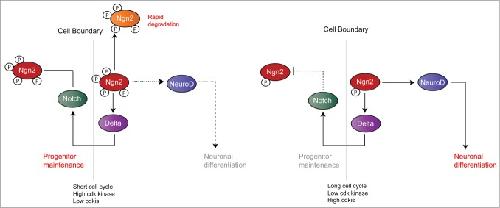 Figure 2. Model illustrating why phosphorylated Ngn2, found when cdk kinase levels are high, favors progenitor maintenance. Conversely, dephosphorylation of Ngn2 that occurs when cdk levels drop and cdk inhibitors increase, favors differentiation. Taken from ref.7