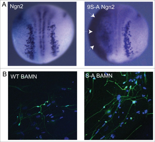 Figure 1. (A) Overexpression of wild-type Ngn2 induces limited ectopic neurons in the Xenopus neural plate and ectoderm on the injected side of the embryo, while 9S-A Ngn2 (phospho-mutant Ngn2) shows considerably greater activity, producing extensive ectopic neurons (arrows) on the flank of the embryo. Taken from ref.5 (B) Brn2, Ascl1, MyT1L and NeuroD together can reprogram human lung fibroblasts into neurons, stained here in green with neural β- tubulin. When wild-type Ascl1 is replaced by S-A Ascl1 (phospho-mutant Ascl1), neurons show significantly increased axonal outgrowth and branching. Taken from ref.7