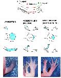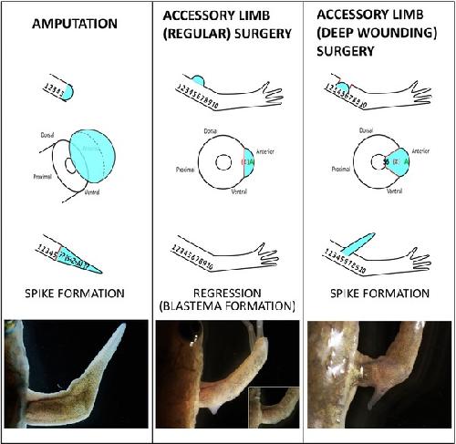 Figure 6. Xenopus limb regeneration and ectopic blastema formation. Left column: Regeneration in an amputated limb. Stylopod is amputated at the S5 position. Hypomorphic structure, called a spike, is induced. Middle column: Accessory blastema induction in a stylopod region. All nerve bundles are rerouted to the skin wound, leading to an ectopic blastema formation. However, the induced blastema cannot keep growing and shrinks at last (inset). Right column: An accessory spike formation. Wounding reaches a stylopod bone and a blastema is induced on the damaged bone. The induced blastema forms a cartilaginous spike. In the picture spike and blastema are induced in the posterior region, not the anterior region, for experimental reasons.
