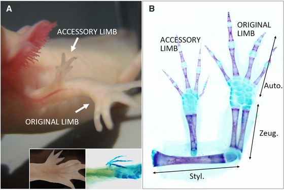 Figure 1. Accessory limb formation in axolotls. (A) A typical phenotype of accessory limb induction in the stylopod. (A, insets) Accessory limb induction in the zeugopod region. Autopod part was induced. Right is the Alcian Blue staining to visualize the skeletal pattern. (B) Cartilage was visualized by Alcian Blue and calcified bone was visualized by Alizarin Red. Auto., autopod; Zeug., zeugopod; Styl., stylopod.