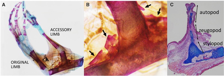 Figure 3. Histological observation. (A), (B) Skeletal pattern was visualized by Alizarin Red and Alcian Blue. (B) Higher magnification of (A). Some ectopic bone formations can be seen in the proximal region. Such ectopic bone particles cannot be seen in the distal region. (C) Hematoxylin, eosin, and Alcian Blue staining. The regenerating half stylopod consisted of relatively fat cartilage compared with cartilage in the distal region.
