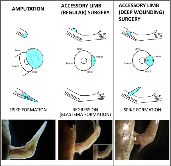Figure 2. Proximal−distal reorganization in the ALM. Top: Conceptual positional values. S, stylopod; Z, zeugopod; A, autopod. Numbers 1−10 are assigned from proximal to distal. Left column: Regeneration in an amputated limb. Stylopod is amputated at the S5 position and S6−10 are restored by a regular limb regeneration process. Middle column: Accessory limb induction in a stylopod region. Basically the limb surface (skin) is damaged and a blastema is induced on the surface of the limb. A blastema acquires A+Z values, resulting in lower limb formation. Right column: An accessory limb with half stylopod. Wounding reaches a stylopod bone and a blastema is induced on the damaged bone. The induced blastema contains S6−10 values and regenerates an accessory limb with half stylopod.