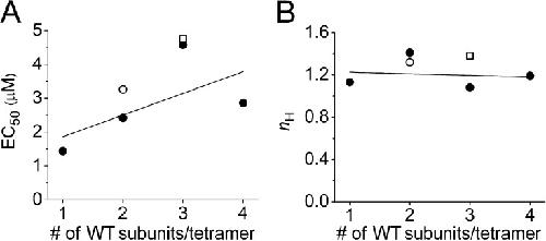 Figure 5. The concentration response relationship for PD-induced increase in Itail is not dependent on the number of WT subunits in a concatenated tetramer. (A) Plot of EC50 as a function of the number of WT subunits in a tetramer. Line represents linear fit to data: y = 0.64x + 1.22 (adjusted R2 = 0.099). (B) Plot of nH as a function of number of WT subunits in a tetramer. Line represents linear fit to data: y = −0.015x + 1.24 (adjusted R2 = −0.473). In both panels, the open circle represents LE1/WT1/LE1/WT1 channels; the open square represents WT3/LE1 channels.