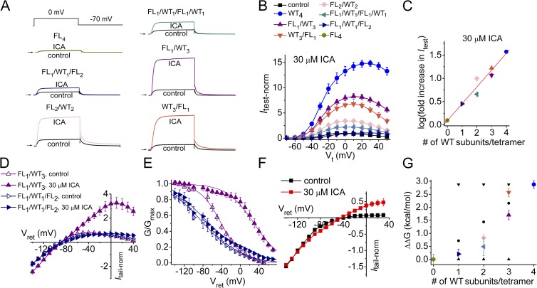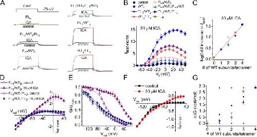 Figure 9. Attenuation of hERG1 inactivation by ICA exhibits positive cooperativity. (A) Representative current traces under control conditions and after 10 µM ICA for tetramers containing the indicated number and orientation of WT and F557L subunits. (B) Normalized Itest-Vt relationships for concatenated tetramers measured in the presence of 30 µM ICA (n = 4–10). Currents were normalized to the peak Itest under control conditions for each channel type. Symbol legends refer to data plotted in B, C, and G. (C) Correlation between log fold increase in Itest at 20 mV induced by 30 µM ICA and the number of WT subunits (i.e., number of functional ICA binding sites) in a concatenated tetramer. Data were fitted with a linear function: y = 0.36x + 0.1 (R2 = 0.94). (D) Fully activated Itail-Vret relationship for FL1/WT3 and FL1/WT1/FL2 tetramers before and after 30 µM ICA (n = 4). Currents were normalized to control Itail at −120 mV. (E) Voltage dependence of inactivation for FL1/WT3 and FL1/WT1/FL2 tetramers before and after 30 µM ICA (n = 4). V0.5inact and z values are presented in Table 2. (F) Effect of 30 µM ICA on the fully activated Itail-Vret relationships for WT4 channel currents recorded from oocytes bathed in a solution containing 20 mM KCl (n = 4). Data were normalized to Itail measured at −120 mV under control conditions. (G) Plot of calculated energy values, ΔΔG = |zFV0.5inact(30μM ICA)−zFV0.5inact(control)|, versus number of WT subunits contained in a concatenated tetramer compared with the relationships predicted for independent subunit transitions (▾) and cooperative subunit interactions, models 1 (▴) and 2 (•). Data are expressed as mean ± SEM (n = number of oocytes). Standard errors in zFV0.5inact were calculated as described previously (Yifrach and MacKinnon, 2002).