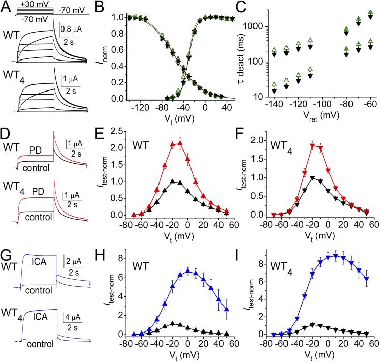 Figure 1. Concatenated tetrameric hERG1 (WT4) channels have similar biophysical and pharmacological properties as channels formed by coassembly of single WT hERG1 subunits. (A) Representative WT and WT4 hERG1 channel currents recorded at the indicated Vt (−70 to 30 mV stepped in 20-mV increments). (B) The voltage dependence of WT channel gating (upright green triangles, activation; sideways green triangles, C-type inactivation) is similar to WT4 channels (upside-down black triangles, activation [n = 6]; sideways black triangles, C-type inactivation [n = 8]). Data were fitted to Boltzmann function (smooth curves) to determine V0.5act and z values (presented in Table 1). (C) Time constants (τ deact) for fast and slow components of current deactivation for WT (green triangles, n = 10) and WT4 (black triangles, n = 11) channels at the indicated return potential (Vret). (D) Effect of 10 µM PD on WT and WT4 hERG1 channel currents elicited by 4-s step to 0 mV. Itail was measured at −70 mV. (E and F) Itest-Vt relationships in the absence (black triangles) and presence of 10 µM PD (red triangles) for oocytes injected with cRNA encoding single WT subunits (E, n = 10) or WT4 channels (F, n = 7). Currents were normalized to peak Itest (at −20 mV) measured under control conditions. (G) Effect of 10 µM ICA on currents for WT and WT4 channels. (H and I) Itest-Vt relationships in the absence (black triangles) and presence of 10 µM ICA (blue triangles) for oocytes injected with cRNA encoding single WT subunits (H, n = 5) or WT4 channels (I, n = 10). Data are expressed as mean ± SEM (n = number of oocytes).