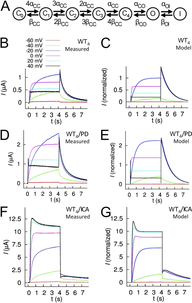 Figure 2. Markov modeling of hERG1 tetrameric channel currents modified by drugs PD and ICA. (A) The model comprises seven states (C0,…,C4, closed states; O, open state; I, inactivated state) coupled with the indicated rate coefficients. (B) Averaged currents (n = 4) from oocytes expressing WT4 tetramers under control conditions in response to voltage steps to the indicated Vt. (C) Simulated currents for WT4 tetramers under control conditions. (D and E) Averaged currents measured from the same oocytes as in B, after application of 30 µM PD (D), and corresponding simulated currents (E). (F and G) Averaged currents (n = 6) measured after application of 30 µM ICA (F) and corresponding simulated currents (G). Currents shown in B, D, and F were not leak subtracted.