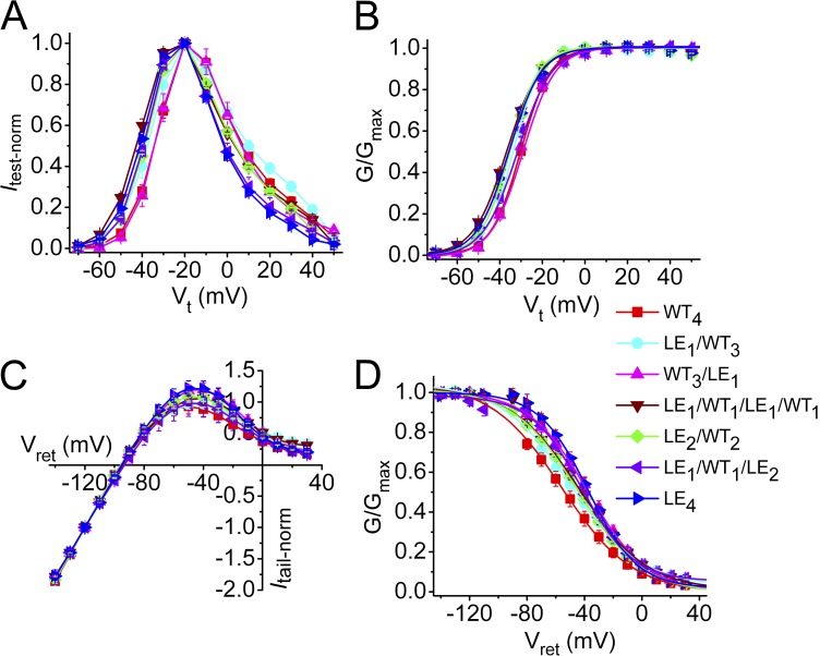 Figure 3. Biophysical properties of concatenated LEn/WT4−n tetrameric hERG1 channels. (A) Itest-Vt relationships. (B) Voltage dependence of activation. (C) Fully activated Itail-Vret relationships. (D) Voltage dependence of inactivation. Legend refers to all panels. Data are expressed as mean ± SEM (n = 5–12; values for V0.5 and z for activation and inactivation are presented in Table 1; n = number of oocytes).