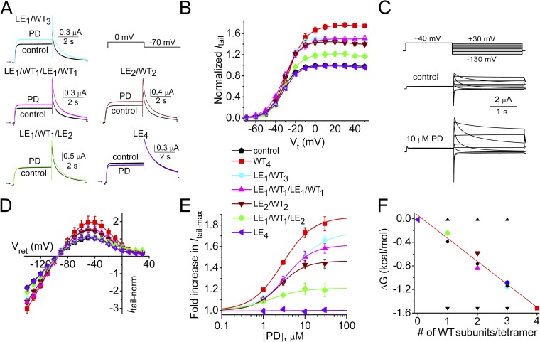 Figure 4. PD-induced enhancement of hERG1 current indicates cooperative subunit interactions. (A) Representative current traces recorded at 0 mV for concatenated tetramers containing zero to three WT subunits together with one to four L646E subunits, before and after 10 µM PD. (B) Effect of 10 µM PD on voltage dependence of channel activation. Itail was measured at −70 mV after pulses to the indicated Vt and normalized to Itail-max under control conditions for each channel type (n = 7–15). The symbol legend between B and E refers to data plotted in B and D–F. Control Itail-Vt relationship (black pentagons) overlaps data for LE4 channels and represents the mean of all channel types. The V0.5act and z values obtained from fitting Itail-Vt relationships to a Boltzmann function (smooth curves) before and after 10 µM PD are presented in Table 1. (C) Pulse protocol (top) used to measure fully activated Itail-Vret relationship and representative currents for WT4 channels under control conditions and after 10 µM PD as indicated. (D) Effect of 10 µM PD on Itail-Vret relationships (n = 4–9) normalized to Itail at −120 mV under control conditions for LEn/WT4−n tetramers (n = 0–4). (E) [PD]-response relationships for fold increase in Itail-max at −70 mV for different tetramers according to symbol legend shown between B and E. Data were fitted with a logistic equation to determine EC50 values and Hill coefficient, nH (see Fig. 5). (F) Plot of ΔG versus number of WT subunits contained in a concatenated tetramer. ΔG was equal to −RTlnKeq, where Keq was defined as Po/(1 − Po) at maximal effect of PD and assuming maximum Po in the absence of drug to be 0.5. Linear regression analysis was used to fit calculated data (colored symbols; solid line: y = −0.39x + 0.058; R2 = 0.96) and the relationships predicted for independent subunit transitions (▾) and cooperative subunit interactions, models 1 (▴) and 2 (•). Data are expressed as mean ± SEM (n = number of oocytes).