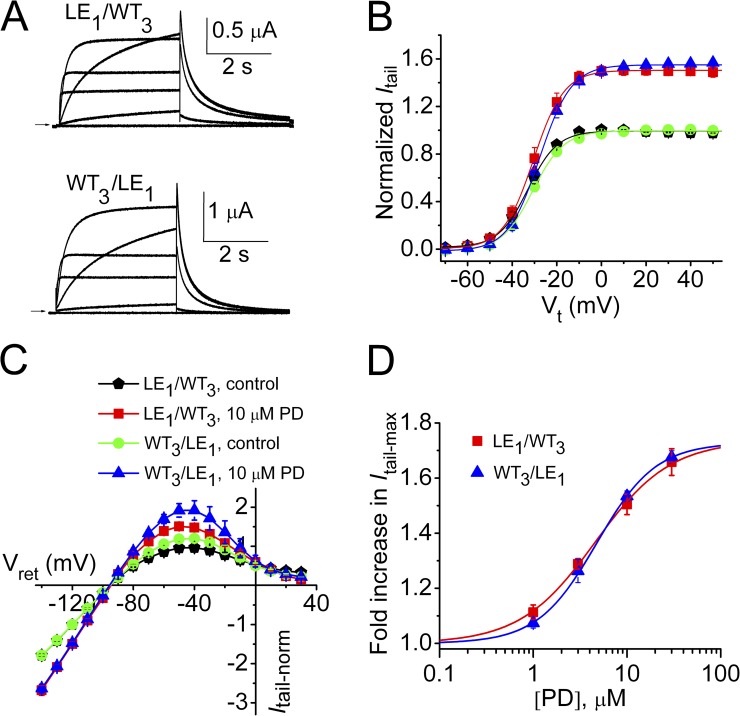 Figure 6. Positioning of a single LE mutant subunit in a concatenated hERG1 tetramer does not affect biophysical properties or response to PD. (A) Representative current traces for LE1/WT3 and WT3/LE1 hERG1 channels. Pulses were applied to Vt of −70 to 30 mV in 20-mV increments. Vh was −80 mV and Vret was −70 mV. (B) Normalized Itail-Vt relationships before and after 10 µM PD. Symbol legend is the same as for C. For LE1/WT3 hERG1 channels: V0.5act = −32.1 ± 1.3 mV, z = 4.13 ± 0.14 mV (control); V0.5act = −30.1 ± 1.6 mV, z = 4.20 ± 0.07 mV (PD; n = 11). For WT3/LE1 hERG1 channels: V0.5act = −29.1 ± 1.5 mV, z = 3.36 ± 0.21 mV (control); V0.5act = −27.1 ± 1.3 mV, z = 3.44 ± 0.16 mV (PD; n = 4). (C) Normalized fully activated Itail-Vret relationships determined before and after 10 µM PD. (D) [PD]-response relationships for LE1/WT3 hERG1 channels (EC50 = 4.6 µM, nH = 1.1; n = 6–9) and WT3/LE1 hERG channels (EC50 = 4.8 µM, nH = 1.4; n = 4). Data are expressed as mean ± SEM (n = number of oocytes).