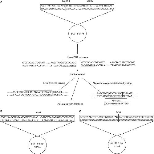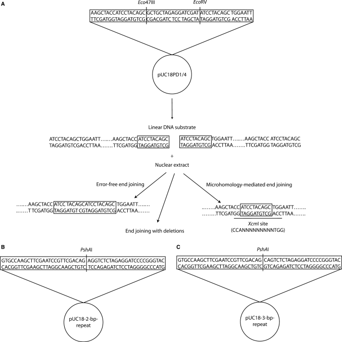 Figure 1. DNA substrates of end-joining assays. (A) The plasmid pUC18PD1/4 was digested with Eco47III and EcoRV, resulting in a blunt-ended linear molecule with a 10-bp direct repeat (ATCCTACAGC) at each end. Deletion of one 10-bp repeat in joined DNA will produce an XcmI restriction site. This particular restriction site can not be created by other joining reactions. (B) The plasmids pUC18-2-bp-repeat and pUC18-3-bp-repeat were digested with PshAI, resulting in blunt-ended linear molecules with a 2-bp (AG) or 3-bp (CAG), respectively, direct repeat at each end.