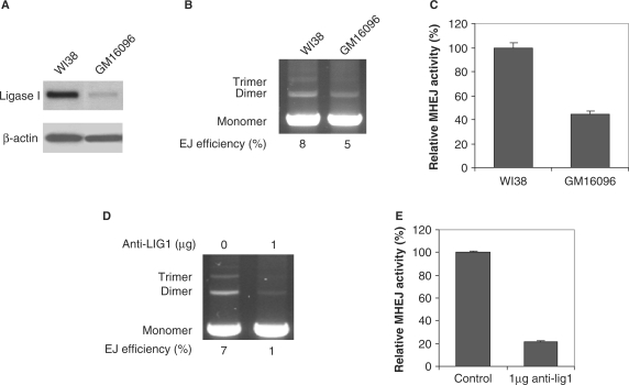 Figure 3. Mutation in the ligase I gene results in decreased MHEJ. (A) Western blot analysis with the antibody against DNA ligase I. GM16096 cells are primary human fibroblast cells that carry two different missense mutations in the ligase I gene. WI38 cells are primary normal human fibroblasts. (B) End-joining activities. End-joining assays were carried out using 1 μg nuclear extract prepared from GM16096 or WI38 fibroblast cells. (C) Quantification of MHEJ activity. (D) Inhibition of end-joining by anti-Ligase 1 antibodies. Nuclear extract from HTD114 cells (1.6 µg total protein) was incubated for 30 min on ice with 1 µg antibody against human DNA ligase I, then incubated with 400 ng linear DNA at 14°C. After 1 h incubation, DNA products were analyzed by agarose gel electrophoresis. (E) Quantification of MHEJ affected by anti-ligase 1 antibodies.