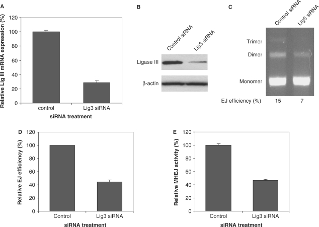 Figure 4. Down-regulation of DNA ligase III results in decreased MHEJ activity. HTD114 cells were transfected with nontargeted siRNA (control) or siRNA oligonucleotides against ligase III (siRNA 121668). Forty-eight hours after transfection, total RNA and nuclear extracts were prepared. Expression of ligase III at mRNA level and protein level was determined by quantitative real time-PCR (A) and by immunoblotting analysis (B), respectively. (C) End-joining activity affected by the reduction of ligase III. Linearized pUC18PD1/4 DNA (300 ng) was incubated with 1 μg nuclear protein extracts from HTD114 transfected with nontargeted siRNA (lane 1) or the ligase III siRNA 121668 (lane 2). (D) A summary of three independent end-joining reactions as performed in (C). (E) Quantification of MHEJ.