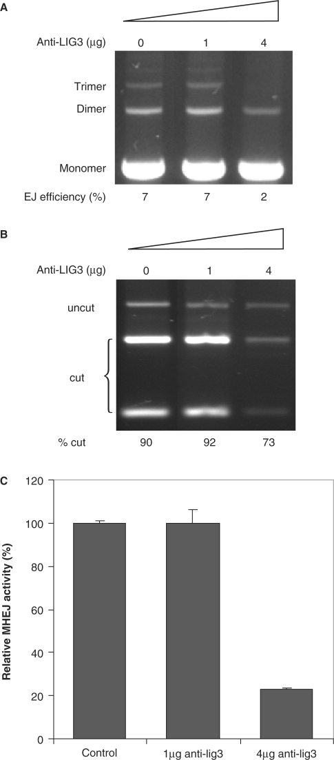 Figure 5. Requirement of DNA ligase III in MHEJ. (A) The effect of anti-ligase III antibodies. Nuclear extract from HTD114 cells (1.6 µg total protein) was incubated for 30 min on ice with the antibody against human DNA ligase III, then incubated with 400 ng linear DNA at 14°C. After 1 h incubation, DNA products were analyzed by agarose gel electrophoresis. (B) PCR products of end-joined products shown in (A) were digested with XcmI. (C) Quantification of MHEJ.