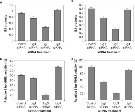 Figure 8. The involvement of DNA ligases I, III and IV in 2- and 3-bp MHEJ. End-joining reactions were carried out by incubating 300 ng linearized pUC18-2-bp-repeat (containing a 2-bp, AG repeat at each end, A) or pUC18-3-bp-repeat (containing a 3-bp, CAG repeat at each end, B) with nuclear extracts (1 μg) prepared from HTD114 cells treated with nontargeted siRNA, or siRNA against ligase I (121248), III (121668), or IV (121372). The amount of end-joined products from individual reactions was determined with a quantitative real time-PCR assay as described in Materials and methods section. The bar represents the mean end-joining efficiency of three independent reactions and the error bar is SEM. The activity of MHEJ using 2-bp (C) or 3-bp (D) microhomology was determined by multiplying the end joining efficiency (A and B) with the fraction of end-joined products mediated by 2- or 3-bp microhomology (Table 2).