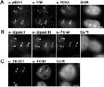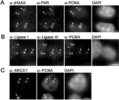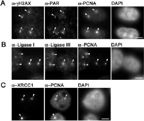Figure 1. Immunochemical detection of DNA repair intermediates after laser microirradiation. Widefield fluorescence images of HeLa cells are shown. Cells were fixed â¼5 min after laser microirradiation. Arrows mark sites of irradiation. (A) Laser microirradiation with 405 nm results in local generation of DSBs and SSBs detected by antibodies against γ-H2AX and PAR, respectively. Accumulation of endogenous PCNA can be observed at these sites. (B) Both, DNA Ligase I and III accumulate at sites of DNA damage and colocalize with PCNA. (C) XRCC1 and PCNA accumulate at laser-induced DNA damage sites. Scale bars, 5 μm.