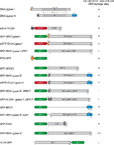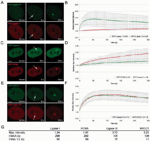 Differential recruitment of DNA Ligase I and III to DNA repair sites.