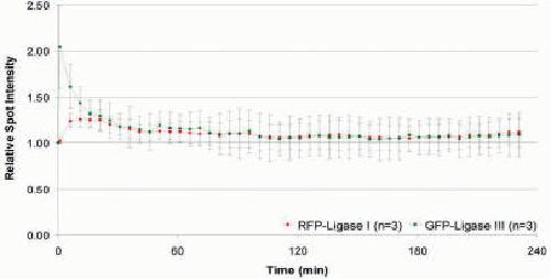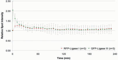 Figure 4. Release kinetics of DNA Ligase I and III at DNA repair sites. Microirradiated HeLa cells were followed up several hours with a time interval of 5 min. Maximum projections of 10–12 z-Stacks were collected and the fluorescence intensities at the irradiated sites calculated and plotted as a function of time.