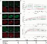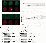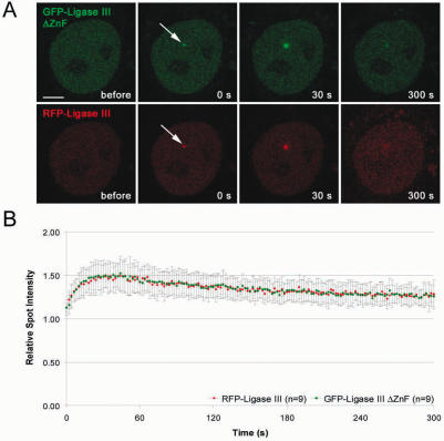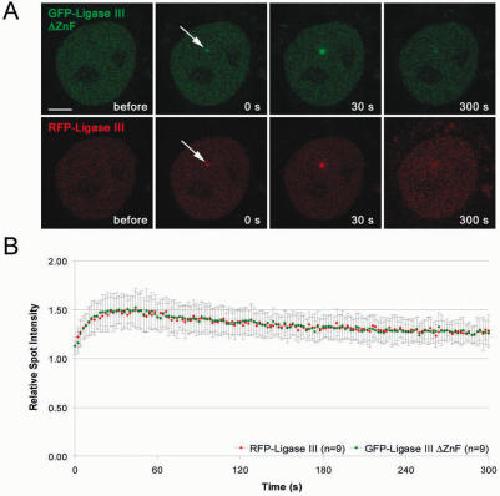 Figure 7. Deletion of the ZnF motif does not abolish recruitment of DNA Ligase III. Recruitment kinetics were determined as described in Figure 3. (A) Live cell imaging of a microirradiated HeLa cell coexpressing GFP-DNA Ligase III ΔZnF and RFP-Ligase III which accumulate at DNA repair sites (arrow). Times after microirradiation are indicated. Scale bars, 5 μm. (B) Recruitment kinetics of GFP-DNA Ligase III ΔZnF and RFP-Ligase III at microirradiated sites.
