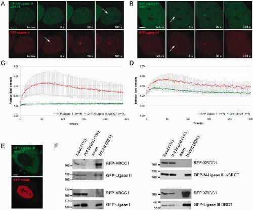 Figure 8. Recruitment of DNA Ligase III to DNA damage sites is mediated by XRCC1. Recruitment kinetics were determined as described in Figure 3. (A) Live cell imaging of a microirradiated HeLa cell coexpressing GFP-N-DNA Ligase III ΔBRCT, containing an additional SV40 NLS and RFP-Ligase III. Deletion of the BRCT domain in GFP-N-DNA Ligase III ΔBRCT abolishes recruitment to sites of DNA damage, whereas RFP-Ligase III accumulates at these sites as seen in Figure 3 (arrow). (B) A HeLa cell coexpressing GFP-Ligase III BRCT and RFP-Ligase III which both accumulate at sites of microirradiation (arrows). Times after microirradiation are indicated. Scale bars, 5 μm. (C and D) Recruitment kinetics of fluorescence-tagged proteins at microirradiated sites. (E) Deletion of the BRCT domain results in cytoplasmic localization of the fusion protein. (F) Coimmunoprecipitations were performed with 293T cells coexpressing RFP-XRCC1 and GFP-Ligase I or GFP-Ligase III, respectively. For interaction mapping the same deletion constructs as in A–D were used. Immunoprecipitations were performed with an antibody against GFP. Precipitated fusion proteins were then detected with specific antibodies against RFP and GFP on western blots. RFP-XRCC1 was coprecipitated with GFP-Ligase III but not with GFP-Ligase I (left panel). RFP-XRCC1 was also coprecipitated with GFP-Ligase III ΔBRCT but not with GFP-N-Ligase III ΔBRCT (right panel).