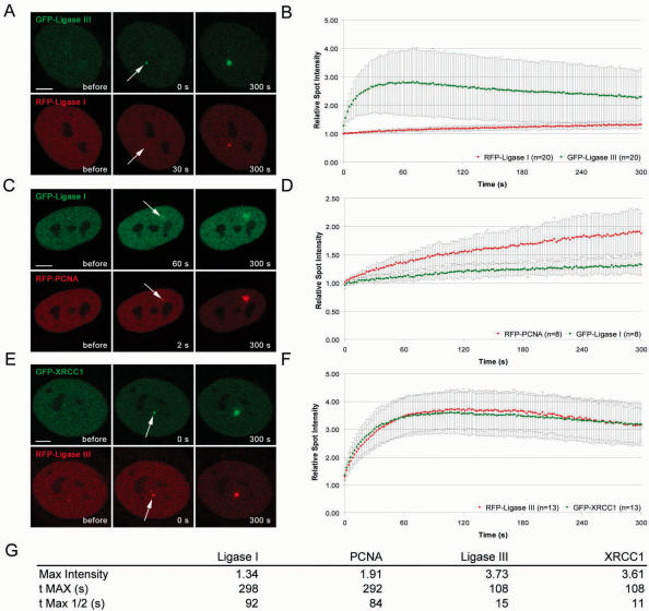 Figure 3. Recruitment kinetics of DNA Ligase I and III at DNA damage sites in living cells. Live cell imaging of microirradiated HeLa cells coexpressing various combinations of GFP- and RFP-tagged DNA Ligase I, DNA Ligase III, PCNA and XRCC1. For determination of the recruitment kinetics the relative fluorescence intensity at the irradiated spot was calculated and plotted as a function of time. The displayed curves were generated after integrating data from at least eight independent experiments. Error bars represent the SD. (A and B) Accumulation of DNA Ligase III at DNA repair sites precedes accumulation of DNA Ligase I (Supplementary Fig3video1). (C and D) Accumulation of RFP-PCNA can be observed as early as 2 s after irradiation, while DNA Ligase I accumulates with a delay of ∼30–60 s (Supplementary Fig3video2). (E and F) Immediate and fast recruitment of GFP-XRCC1 and DNA Ligase III to DNA damage sites (Supplementary Fig3video3). Scale bars, 5 μm. The table in (G) summarizes the kinetic parameters of PCNA, DNA Ligase I, XRCC1 and DNA Ligase III recruitment. Mean values of at least eight different cells are shown.