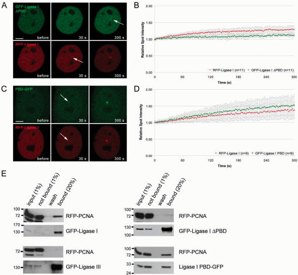 Figure 5. Recruitment of DNA Ligase I to DNA damage sites is mediated by PCNA. Recruitment kinetics were determined as described in Figure 3. (A) Live cell imaging of a microirradiated HeLa cell coexpressing GFP-DNA Ligase I ΔPBD and RFP-Ligase I. Deletion of the PBD in GFP-DNA Ligase I ΔPBD almost completely abolishes recruitment to sites of DNA damage, whereas RFP-Ligase I accumulates at these sites as seen in Figure 3 (arrow). (C) A HeLa cell coexpressing DNA Ligase I PBD-GFP and RFP-Ligase I shows accumulation of both, RFP-Ligase I and DNA Ligase I PBD-GFP, at sites of microirradiation (arrows). Times after microirradiation are indicated. Scale bars, 5 μm. (B and D) Recruitment kinetics of fluorescence-tagged proteins at microirradiated sites. (E) Coimmunoprecipitations were performed in 293T cells coexpressing different combinations of RFP and GFP fusion constructs. For interaction mapping the same deletion constructs as in A–D were used. Immunoprecipitations were performed with an antibody against GFP. Precipitated fusion proteins were then detected with specific antibodies against RFP and GFP on western blots. RFP-PCNA coprecipitated with GFP-Ligase I but not with GFP-Ligase III (left panel). RFP-PCNA was also coprecipitated with Ligase I PBD-GFP but not with GFP-Ligase I ΔPBD (right panel).