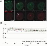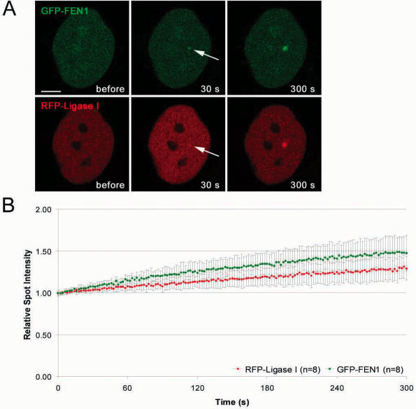 Figure 6. Recruitment kinetics of the PCNA interacting proteins DNA Ligase I and FEN-1 are similar. The structure of the fusion proteins is depicted in Figure 2. (A) Live cell imaging of a microirradiated HeLa cell coexpressing GFP-FEN-1 and RFP-Ligase I. Both FEN-1 and DNA Ligase I accumulate at DNA repair sites (arrow) with similar kinetics. Times after microirradiation are indicated. Scale bars, 5 μm. (B) Recruitment kinetics of fluorescence-tagged proteins at microirradiated sites.