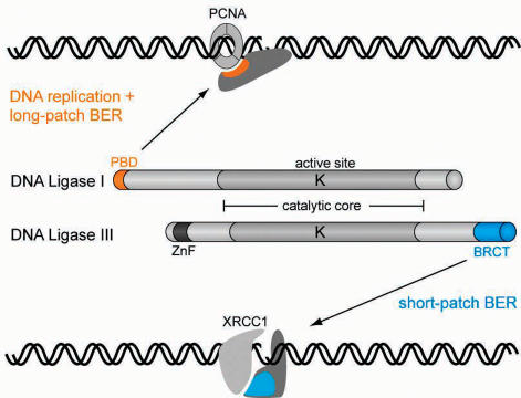 Figure 9. Model for selective targeting of DNA Ligase I and III to DNA replication and different repair pathways. All DNA Ligases use the same catalytic mechanism and show high sequence similarity in the catalytic core (grey shading). The active site lysine residue (K) in the center of the catalytic domain is directly involved in the ligation reaction. However, DNA Ligases have non-overlapping functions in DNA repair and replication and are not interchangeable. We could show that DNA Ligase I and III are targeted to different repair pathways through their regulatory PBD and BRCT domains which mediate interaction with PCNA and XRCC1, respectively. This selective recruitment of specialized DNA Ligases may accommodate the specific requirements of different repair pathways and thereby enhance repair efficiency.