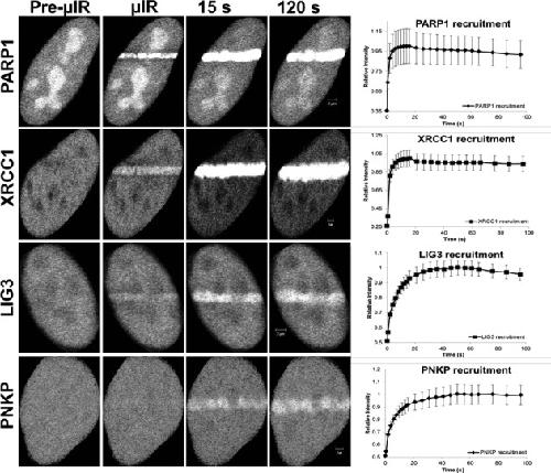Figure 3. Recruitment and retention of SSBR proteins following multi-photon 750-nm laser micro-irradiation. EGFP-PARP1, XRCC1-mGFP and EGFP-LIG3 show near instantaneous recruitment to sites of DNA damage, and PNKP-mGFP is also rapidly recruited. Laser micro-irradiation using multi-photon 750 nm was carried out as outlined in the Materials and Methods section using HeLa cells expressing fluorescently tagged versions of indicated proteins. Recruitment curves show quantification of signals over the observed time scale starting at the time when the damage is introduced by the laser (t = 0). Error bars represent SEM from three independent experiments for a total of 36 individual cells. |