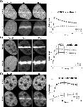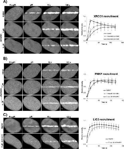 Figure 5. PARP1 inhibition and the recruitment of SSBR proteins to sites of DNA damage. HeLa cells expressing fluorescently tagged SSBR proteins were treated with the PARP inhibitor, AG14361, and then subjected to laser micro-irradiation. PARP inhibition only affected early recruitment events of (A) XRCC1, (B) PNKP and (C) LIG3 with almost no effect on the late events of accumulation of all the proteins at sites of DNA damage. For recruitment curves, error bars represent SEM from three independent experiments for a total of 36 individual cells. |