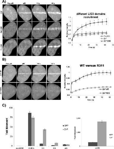Figure 8. The ZnF domain is required for the damage sensing function of LIG3. (A) Comparison of the recruitment of fluorescently tagged full-length (FL) LIG3 and the ZnF and ZnF-DBD domains of LIG3 to micro-irradiated DNA in HeLa cells. (B) Comparison of recruitment of wild type (WT) and the DNA binding mutant of ZnF-R31I to micro-irradiated DNA in HeLa cells. For recruitment curves shown in (A) and (B), bars represent SEM; n = 36. (C) Expression of the ZnF domain of LIG3 retards single-strand break repair. HeLa cells expressing either the GFP-ZnF or GFP alone (control) were treated with 100 μM hydrogen peroxide for 40 min on ice and then strand break repair was monitored by the alkaline comet assay and quantification of tail moments at the indicated time points as described in the Materials and Methods section. Expanding the ordinate (plot on the right-hand side) showed that even in the absence of the hydrogen peroxide the ZnF expressing cells exhibit a slightly higher background level of damage. |