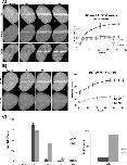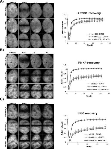 Figure 9. PARP1 inhibition and the retention of SSBR proteins at sites of DNA damage. FRAP analysis on HeLa cells expressing GFP-tagged (A) XRCC1, (B) PNKP and (C) LIG3, respectively, before and after DNA damage with 10 mM hydrogen peroxide in the absence and presence of 2 μM AG14361 as described in the Materials and Methods section. ‘Prebleach’ indicates no photobleaching and ‘Bleach’ is the 0-s time point. For recovery curves, error bars represent SEM; n = 24. |