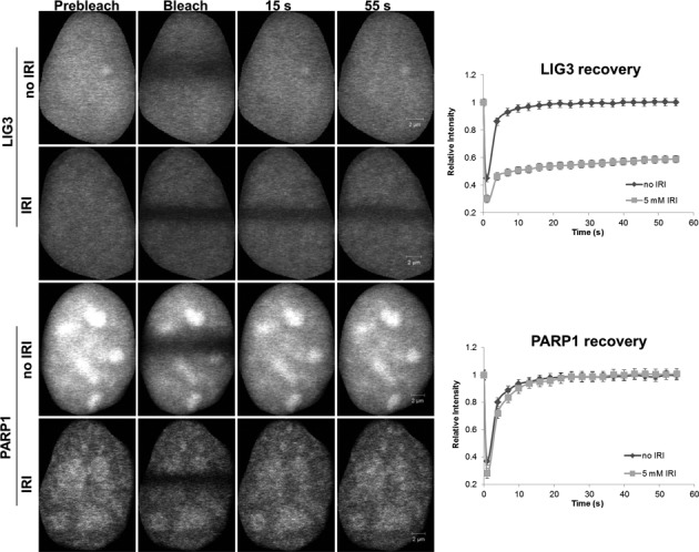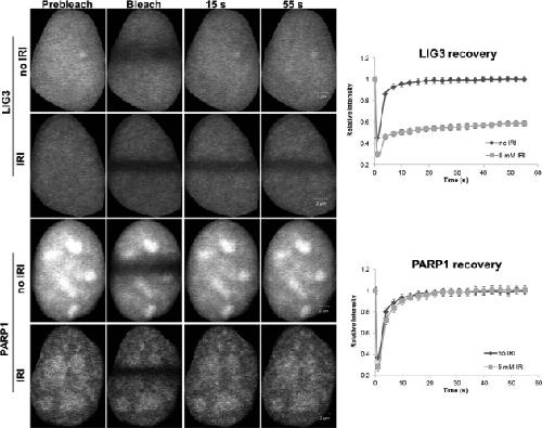 Figure 10. LIG3 is an in vivo nick sensor for irinotecan-induced DNA damage. FRAP analysis showing differences in binding kinetics after 5 mM irinotecan (IRI) treatment in HeLa cells expressing PARP1 and LIG3. ‘Prebleach’ indicates no photobleaching and ‘Bleach’ is the 0-s time point. Error bars represent SEM; n = 24. |