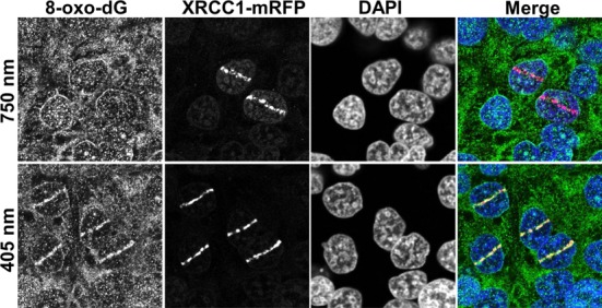 Figure 1. Comparative induction of base damage and strand breaks by different laser micro-IR conditions. Laser micro-irradiation was performed on HeLa cells using either 750-nm multi-photon excitation or a 405-nm laser diode. The production of base damage was gauged on the basis of production of 8-oxo-dG, while XRCC1 recruitment was used as a marker of strand break induction. |