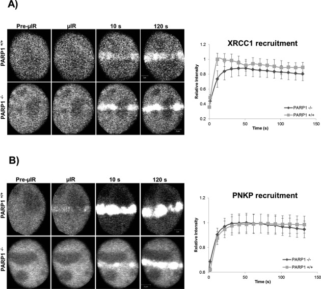 Figure 4. Recruitment of XRCC1 and PNKP in PARP1 WT and KO cells. The recruitment of SSBR proteins was monitored in PARP+/+ and PARP−/− MEFS expressing (A) XRCC1-mGFP and (B) PNKP-mGFP subjected to 750-nm multiphoton micro-irradiation. Error bars represent SEM from three independent experiments for a total of 36 individual cells. |