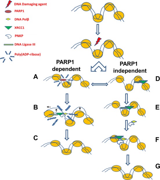 Figure 11. Two pathways exist for the short patch repair of SSBs. In the canonical pathway (PARP1 dependent) (A) PARP1 senses DNA damage and rapidly catalyzes the formation of PAR residues that allow for (B) chromatin expansion which in turn facilitates (C) the recruitment of downstream repair proteins. In the second pathway (PARP1 independent) (D) XRCC1–LIG3 complex continuously scans the DNA, upon sensing an interruption (via LIG3), (E) the complex is capable of causing a localized nucleosomal disruption (dependent on LIG3) (42), and the scaffold XRCC1 is capable of (F) loading downstream repair factors, PNKP and Polβ, and then repair continues as previously described (G). |