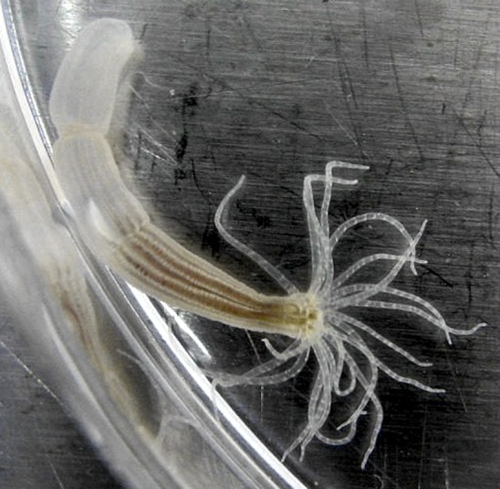Figure 1. The starlet sea anemone.The cnidarians, such as the starlet sea anemone (N. vectensis) shown here, have a body form that is very different to the bilaterally symmetrical form found in most other animals. Anemones have a mouth surrounded by tentacles at one end and a foot that attaches to the substrate at the other. Hudry et al. have shown that, despite such a difference in general body form, the Hox-TALE system that operates in the development of cnidarians functions in a similar fashion to the Hox-TALE system of flies and mice.