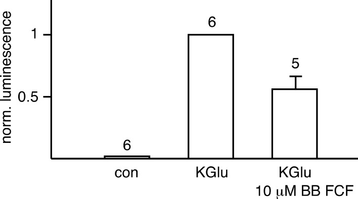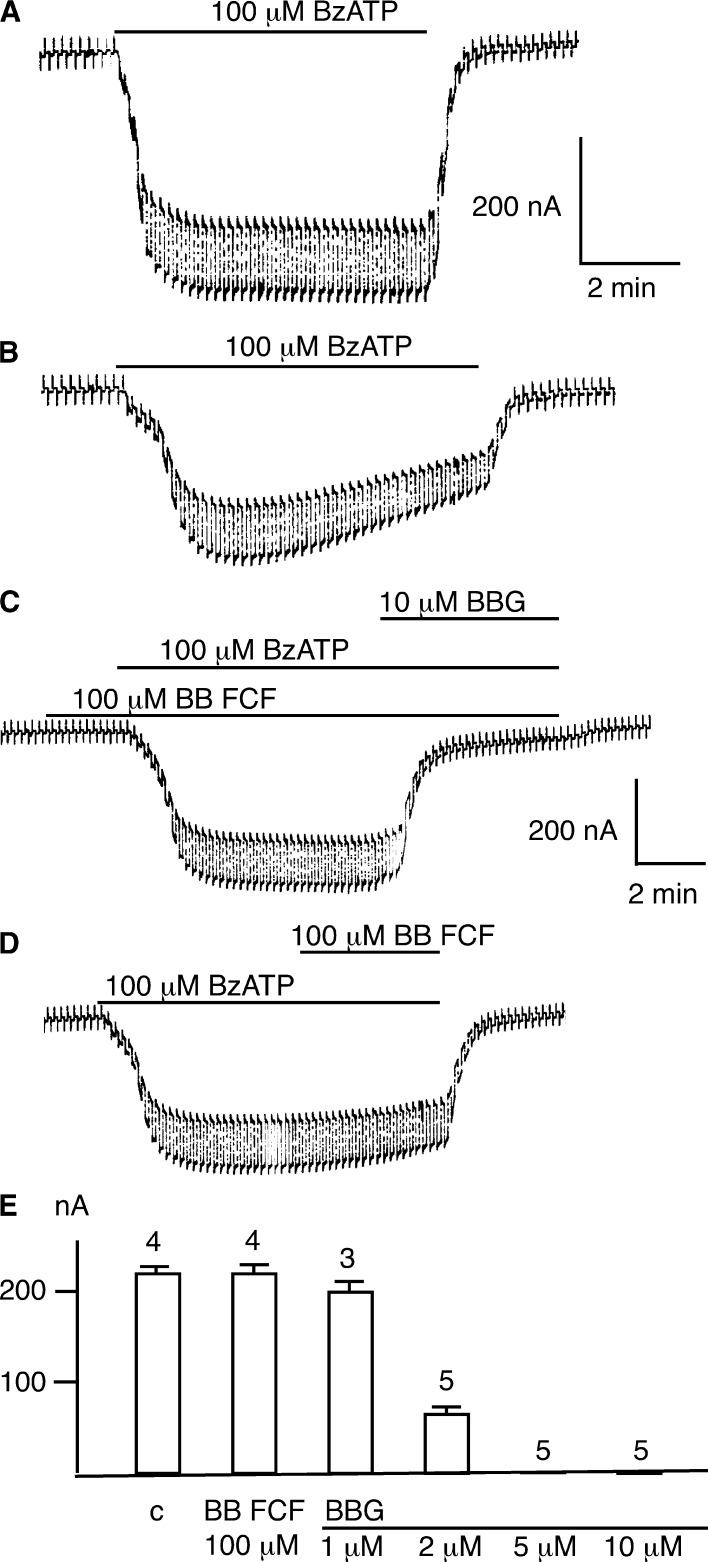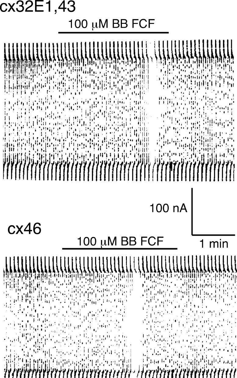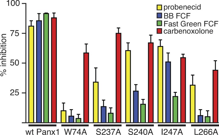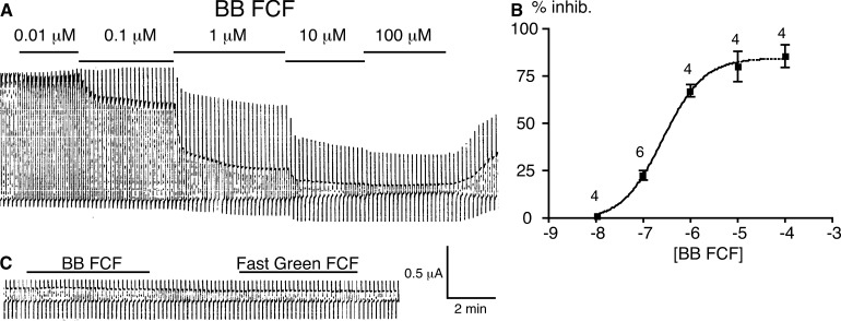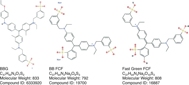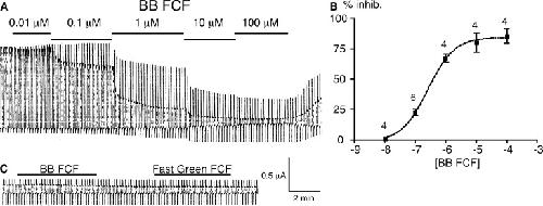 The food dye FD&C Blue No. 1 (Brilliant Blue FCF [BB FCF]) is structurally similar to the purinergic receptor antagonist Brilliant Blue G (BBG), which is a well-known inhibitor of the ionotropic P2X7 receptor (P2X7R). The P2X7R functionally interacts with the membrane channel protein pannexin 1 (Panx1) in inflammasome signaling. Intriguingly, ligands to the P2X7R, regardless of whether they are acting as agonists or antagonists at the receptor, inhibit Panx1 channels. Thus, because both P2X7R and Panx1 are inhibited by BBG, the diagnostic value of the drug is limited. Here, we show that the food dye BB FCF is a selective inhibitor of Panx1 channels, with an IC50 of 0.27 µM. No significant effect was observed with concentrations as high as 100 µM of BB FCF on P2X7R. Differing by just one hydroxyl group from BB FCF, the food dye FD&C Green No. 3 exhibited similar selective inhibition of Panx1 channels. A reverse selectivity was observed for the P2X7R antagonist, oxidized ATP, which in contrast to other P2X7R antagonists had no significant inhibitory effect on Panx1 channels. Based on its selective action, BB FCF can be added to the repertoire of drugs to study the physiology of Panx1 channels. Furthermore, because Panx1 channels appear to be involved directly or indirectly through P2X7Rs in several disorders, BB FCF and derivatives of this "safe" food dye should be given serious consideration for pharmacological intervention of conditions such as acute Crohn's disease, stroke, and injuries to the central nervous system.