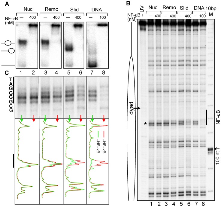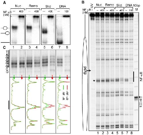 NF-κB is a key transcription factor regulating the expression of inflammatory responsive genes. How NF-κB binds to naked DNA templates is well documented, but how it interacts with chromatin is far from being clear. Here we used a combination of UV laser footprinting, hydroxyl footprinting and electrophoretic mobility shift assay to investigate the binding of NF-κB to nucleosomal templates. We show that NF-κB p50 homodimer is able to bind to its recognition sequence, when it is localized at the edge of the core particle, but not when the recognition sequence is at the interior of the nucleosome. Remodeling of the nucleosome by the chromatin remodeling machine RSC was not sufficient to allow binding of NF-κB to its recognition sequence located in the vicinity of the nucleosome dyad, but RSC-induced histone octamer sliding allowed clearly detectable binding of NF-κB with the slid particle. Importantly, nucleosome dilution-driven removal of H2A-H2B dimer led to complete accessibility of the site located close to the dyad to NF-κB. Finally, we found that NF-κB was able to displace histone H1 and prevent its binding to nucleosome. These data provide important insight on the role of chromatin structure in the regulation of transcription of NF-κB dependent genes.
