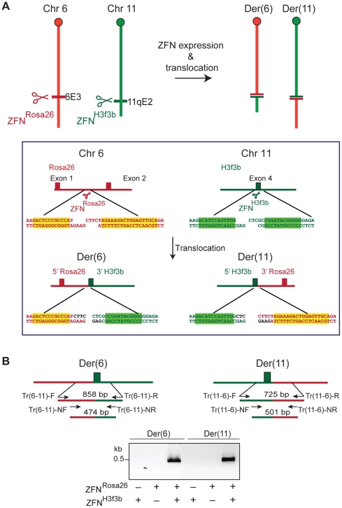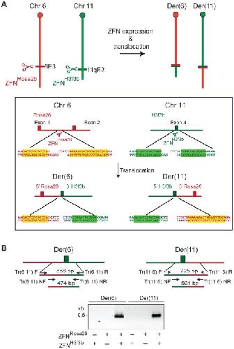 Figure 2. Induction of chromosomal translocations at endogenous mouse loci.(A) DSBs are induced at cleavage sites for the zinc finger nucleases (ZFNs) ZFNRosa26 and ZFNH3f3b on chromosomes 6 and 11, respectively. Joining of DNA ends from 2 different chromosomes can lead to the translocations generating derivative chromosomes der(6) and der(11). Sequences surrounding the DSBs generated by the ZFNs, together with sequences of the resultant translocation chromosomes, are shown. The latter assumes fill-in of the 5′ overhangs and no loss of sequence information from the DNA ends. (B) Nested PCR is used to identify translocation breakpoint junctions for der(6) and der(11), as shown, which is dependent on expression of both ZFNRosa26 and ZFNH3f3b.