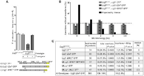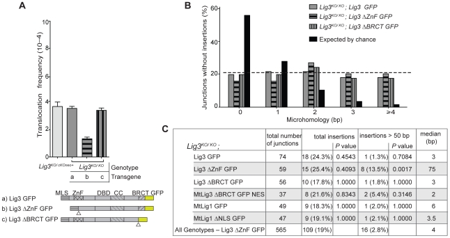 Figure 5. Analysis of Lig3 domain requirements in translocation formation.(A) Deletion of the Lig3 BRCT domain has no effect on translocation frequency, while deletion of the Lig3 ZnF domain reduces translocations. Triangles denote the deletions of the indicated domains. ΔZnF, deletion of Lig3 amino acids 89 to 258 including the ZnF itself and additional sequences which corresponds to a previously described Lig3 ΔZnF mutant [37], [38]; ΔBRCT, deletion of Lig3 amino acids 934 to 1009. (B) Microhomology length distributions in translocation junctions are similar in cells expressing wild-type Lig3 and those expressing either ZnF or BRCT deletions of Lig3. (C) Large, complex insertions are more frequent in cells expressing Lig3 deleted for the ZnF domain. The summary “All Genotypes – Lig3 ΔZnF” denotes all junctions analyzed except those from Lig3KO/KO; Lig3 ΔZnF cells. P values are calculated relative to this group with a Fisher's exact test.