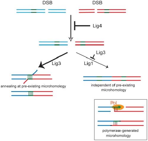 Figure 6. Model for the role of the three mammalian DNA ligases in chromosomal translocation formation in mouse cells.Upon DSB formation on two chromosomes (blue and red lines), Lig4 promotes intrachromosomal joining to maintain genomic integrity and suppresses translocations. Translocations are formed by Lig3, preferentially at short microhomologies (green lines). DNA end resection, which is likely suppressed by Lig4, forms single-stranded DNA to expose microhomologies which can anneal. In the absence of Lig3, Lig1 can form translocations independent of pre-existing microhomology. However, microhomology can also be generated by polymerase (Pol) activity at a DNA end.