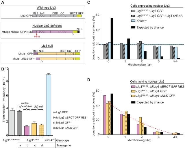 Figure 1. Lig3-deficient mouse cells have fewer chromosomal translocations and reduced microhomology at junctions.(A) DNA ligases expressed from transgenes in Lig3KO/KO cells. Wild-type Lig3 is expressed in control cells. Nuclear Lig3-deficient cells express mitochondria-restricted Lig3 (MtLig3-ΔBRCT-GFP-NES), while Lig3 null cells express mitochondria-targeted Lig1 (MtLig1 or MtLig1-ΔNLS). All transgenes are GFP tagged. MLS, mitochondrial leader sequence from Lig3 for mitochondrial localization; ZnF, zinc finger domain; BRCT, BRCA1 C-terminal related domain; DBD, DNA-binding domain; CC, catalytic core; *M88T, mutation of the Lig3 nuclear translation initiation site which disrupts translation of a nuclear-specific form of Lig3; NES, nuclear export signal derived from MAPKK to exclude Lig3 from the nucleus; ΔNLS, deletion of Lig1 nuclear localization signal (amino acids 135 to 147) to decrease nuclear localization of Lig1; ΔBRCT, deletion of theLig3 BRCT domain (amino acids 934 to 1009); GFP, green fluorescent protein. Triangles denote position of deletions of the indicated domains. A color scheme is used throughout the figures to assist in tracking various ligase forms (gray, wild-type Lig3; purple, mitochondria-only Lig3; orange, Lig1 forms). (B) Translocations are reduced in cell lines without nuclear Lig3. By contrast, translocations increase in cells deficient for Lig4–XRCC4 complex. (C) Microhomology length distributions for der(6) breakpoint junctions are similar for control cells, cells depleted for Lig1, and cells deficient for Lig4–XRCC4, and differ from that expected by the chance presence of microhomology. Only junctions with simple deletions (i.e., without an insertion) are included. The probability that a junction will have X nucleotides of microhomology by chance assumes an unbiased base composition and is calculated as previously described [9]. The transgenes present in the Lig3KO/KO cells are indicated in italics. (D) Microhomology length distributions in cells without nuclear Lig3 are shifted to a distribution similar to that expected by chance.