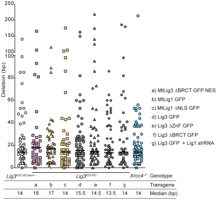 Figure 3. Deletion lengths for der(6) breakpoint junctions.Deletion lengths for the indicated genotypes do not differ significantly from each other. Each value represents the combined deletion from both ends of an individual junction. The median deletion length for each genotype is indicated by a bar on the graph and the value is given below the graph.