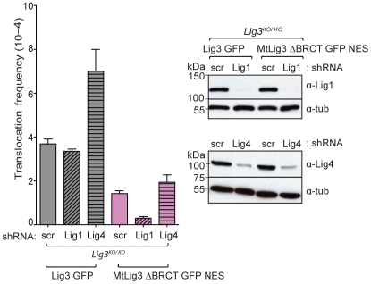 Figure 4. Lig1, but not Lig4, is a backup DNA ligase for translocation formation.Lig1 depletion results in reduced translocation frequency in nuclear Lig3-deficient cells (Lig3KO/KO; MtLig3 ΔBRCT GFP NES), but not in control cells expressing wild-type Lig3 (Lig3KO/KO; Lig3 GFP). By contrast, Lig4 depletion increases translocations significantly in wild-type cells but not nuclear Lig3-deficient cells. Lig1 and Lig4 lentiviral shRNA knockdown are similar in both nuclear Lig3-deficient cells and cells expressing wild-type Lig3. scr, shRNA with a scrambled sequence.