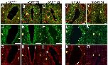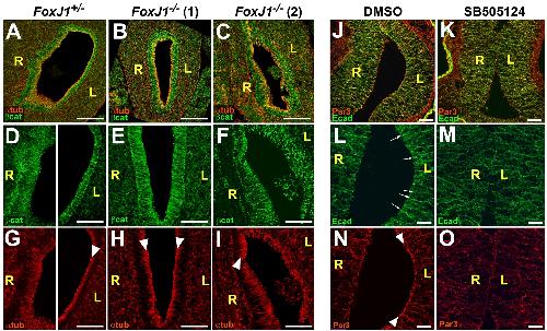 Fig. 3. Asymmetries in stomach epithelial polarity are regulated by left-right signaling. Stomach sections immunostained for α-tubulin (αtub, red) and β-catenin (β-cat, green) in the E11.5 mouse (A-I), or Par3 (red) and E-cadherin (Ecad, green) in the stage 39 frog (J-O), reveal left-right differences in endoderm morphogenesis. In the posterior stomach of Foxj1+/â mice, right endoderm is irregular, whereas left endoderm is more organized (D) and highly polarized, as indicated by tight apical concentration of α-tubulin (αtub, red; arrowhead, G). Both walls of Foxj1â/â mutant embryo [Foxj1â/â(1), B,E,H], comprise polarized cells with tight apical concentration of αtub (arrowheads, H); both sides resemble control left epithelium. In another mutant [Foxj1â/â(2), C,F,I] both sides are irregular and resemble control right epithelium, although sub-regions exhibit greater organization and polarity (arrowhead, I). In control (DMSO) frog embryos (J,L,N), left endoderm is more polarized than right, as indicated by enrichment of E-cadherin (Ecad; green) at apical adherens junctions (arrows, L), and the concentration of the apical polarity marker Par3 at the lumenal surface (red; arrowheads, N). By contrast, SB505124 (K,M,O) results in right isomerism, with left endoderm resembling right endoderm, as indicated by absence of apical enrichment of E-cadherin (M) and Par3 (O). L, left; R, right. Scale bars: 100 μmin A-C; 50 μm in D-K; 25 μm in L-O. (See Fig. S4 for higher magnification images.) |