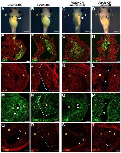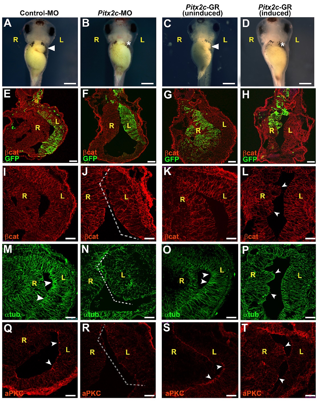 Fig. 4. Pitx2c controls epithelial morphogenesis in left stomach wall. Frog embryos were injected with control morpholino (control-MO; A,E,I,M,Q) or Pitx2c-MO (B,F,J,N,R) targeted to the left side of the stomach, or injected with Pitx2c- GR mRNA (C,G,K,O,S and D,H,L,P,T) targeted to the right side. (See Fig. S6A,B for morpholino validation.) In injected embryos (A-D), the greater curvature of the stomach at stage 42 is indicated by an arrowhead (A,C); absence of curvature is specified by an asterisk (B,D). Sections through stage 39 stomachs (E-T) were stained for β-catenin (βcat; red; E-L), α-tubulin (αtub; green; M-P) or atypical PKC (aPKC; red; Q-T). GFP mRNA was coinjected as a lineage tracer to confirm proper targeting (green; E-H). MO depletion on the left (F) or ectopic activity of Pitx2 on the right (H) results in a loss of asymmetry within the stomach compared with controls (E,G, respectively). In addition, compared with control-MO injected embryos, in which αtub and aPKC are concentrated at the apical surface of the left stomach wall (arrowheads in M,Q, respectively), MO depletion of Pitx2c disrupts epithelial architecture (brackets in J,N,R). Meanwhile, dexamethasone induction of Pitx2c activity in the right wall polarizes stomach endoderm, as indicated by ectopic regions of polarized epithelial architecture (arrowheads in L,P,T), correlating with ectopic αtub (P) and aPKC (T), which are not observed in right wall of uninduced controls (K,O,S). Scale bars: 500 μm in A-D; 75 μm in E-H; 50 μm in I-T. L, left; R, right. |