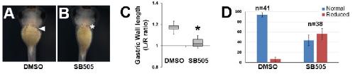 Figure S2. SB505124 exposure inhibits stomach curvature. Stage 19/20 frog embryos were exposed to DMSO (A) or 5uM SB505124 (B) through stage 42. C) The normal left/right (L/R) ratio of the lengths of the stomach walls is eliminated in SB505124-dosed embryos (* denotes p<0.01). The graph (D) indicates the percentage of embryos in which the greater curvature of the stomach is normal (e.g., arrowhead in A) or reduced/absent (* in B). |