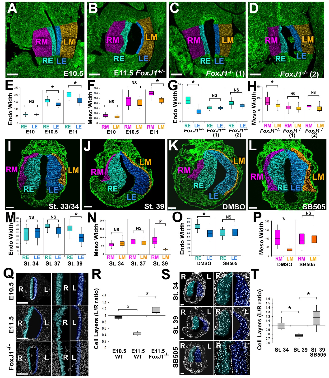 Fig. 2. Asymmetries in tissue architecture are regulated by left-right patterning. Sections through mouse (A-D) or frog (I-L) stomachs were stained for β-catenin (A-D) or integrin (I-L) (green) and false color-coded as in Fig. 1 (RE, right endoderm; LE, left endoderm; RM, right mesoderm; LM, left mesoderm). The widths of the endoderm (Endo) and mesoderm (Meso) are significantly different by E10.5-11 in mouse (E,F) and stage 39 in frog (M,N). In Foxj1+/â controls (E11.5), the lumen expands leftward and left-right differences in tissue width are evident (B); however, in Foxj1â/â mutants, the normal leftward expansion of the stomach is perturbed (C,D), and left-right differences in tissue width are eliminated (G,H). Likewise, frog embryos exposed to DMSO show normal leftward expansion of the stomach lumen (K); this is eliminated in embryos exposed to a Nodal inhibitor (SB505124; L), as are normal left-right differences in widths of endoderm and mesoderm (O,P). Nuclear staining reveals asymmetry in the number of endoderm cell layers in the right (teal) versus left (blue) stomach walls by E11.5 in mouse (Q,R) and stage 39 in frog (S,T); this asymmetry is perturbed in Foxj1â/â mutants (Q,R) and in frog embryos exposed to SB505124 (S,T). Scale bars: 100 μm in A-D,Q; 75 μm in I-L,S. *P<0.01; NS, not significant. |