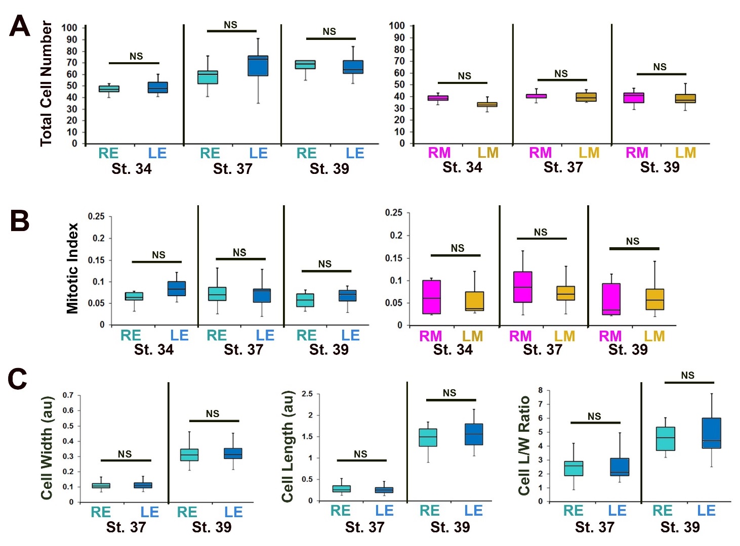 Figure S3. Morphometric comparison of cell properties in the left and right stomach walls. Sections of the developing stomach were immunohistochemically stained to reveal cell outlines or mitotic nuclei, and the indicated features were counted and/or measured at St. 34, 37 and 39, using at least 3 sections from each of 3 different embryos. At no stage are the total number of cells (A) or mitotic indices (B; number of pHH3+ cells/number of total cells) statistically different between the left and right sides. Likewise, there is no statistical difference in endoderm cell width, length or length/width (L/W) ratio between sides during curvature formation (C). RE, right endoderm; LE, left endoderm; RM, right mesoderm; LM, left mesoderm |