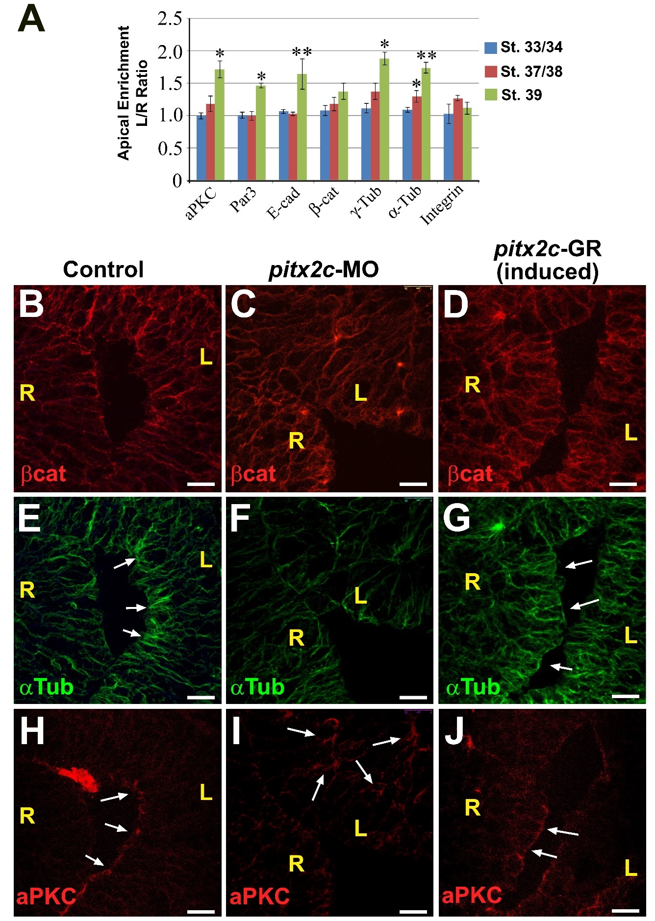 Figure S4. Markers of apicobasal polarity become left-right asymmetric in the developing stomach. The intensity of several markers of apical polarity, including aPKC, Par3, E-cadherin (E-cad), alpha-tubulin (a-tub) and gamma-tubulin (g-tub) were measured at the left and right surfaces of the frog stomach lumen at the indicated stages using image J (A). The level of apical enrichment is represented as a ratio of left and right intensities measured in at least 3 sections of 3-5 different embryos. The left/right (L/R) ratios of all apical markers become significantly different by stage 39, while the L/R ratios of Beta-catenin (B-cat) and integrin are not significantly >1. B-J) High magnification images of sections through the Stage 39 stomach stained forB-catenin B-cat; red; BD), alpha-tubulin (atub; green; E-G), or atypical PKC (aPKC; red; H-J). Compared to control embryos (B, E, H), in which a-tub and aPKC are concentrated at the apical surface of the left stomach wall (arrowheads in E, H, respectively), MO depletion of Pitx2c (C, F, I) disrupts epithelial architecture (arrows in I). Meanwhile, dexamethasone-induction of Pitx2c activity (D, G, J) in the right wall ectopically polarizes the stomach endoderm, as indicated by ectopic regions of polarized epithelial architecture, correlating with enriched ï¡tub and ectopic aPKC at the apical surface (arrows in G, J). Scalebars = 25uM. Left (L), Right (R). |